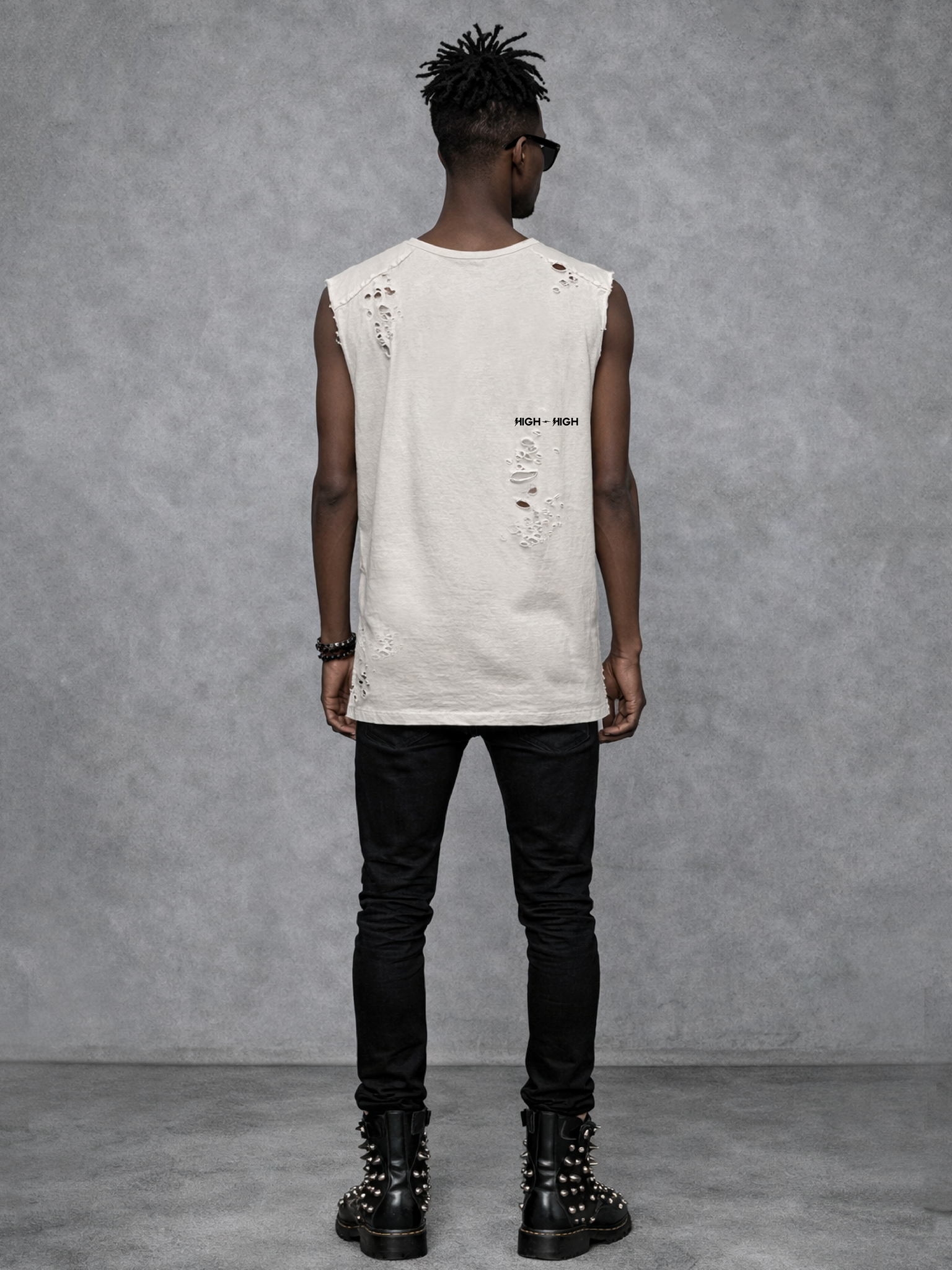 regata em malha leve, modelagem regular, recortes nos ombros, estampa frontal e nas costas, rasgos pontuais.